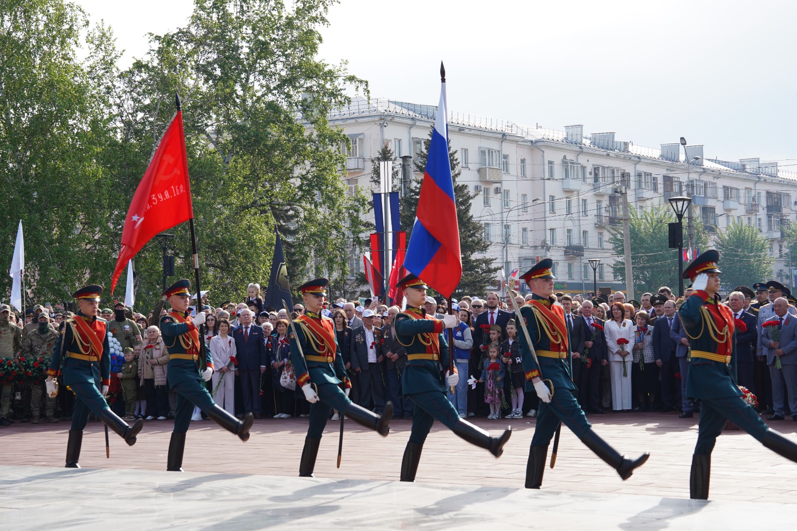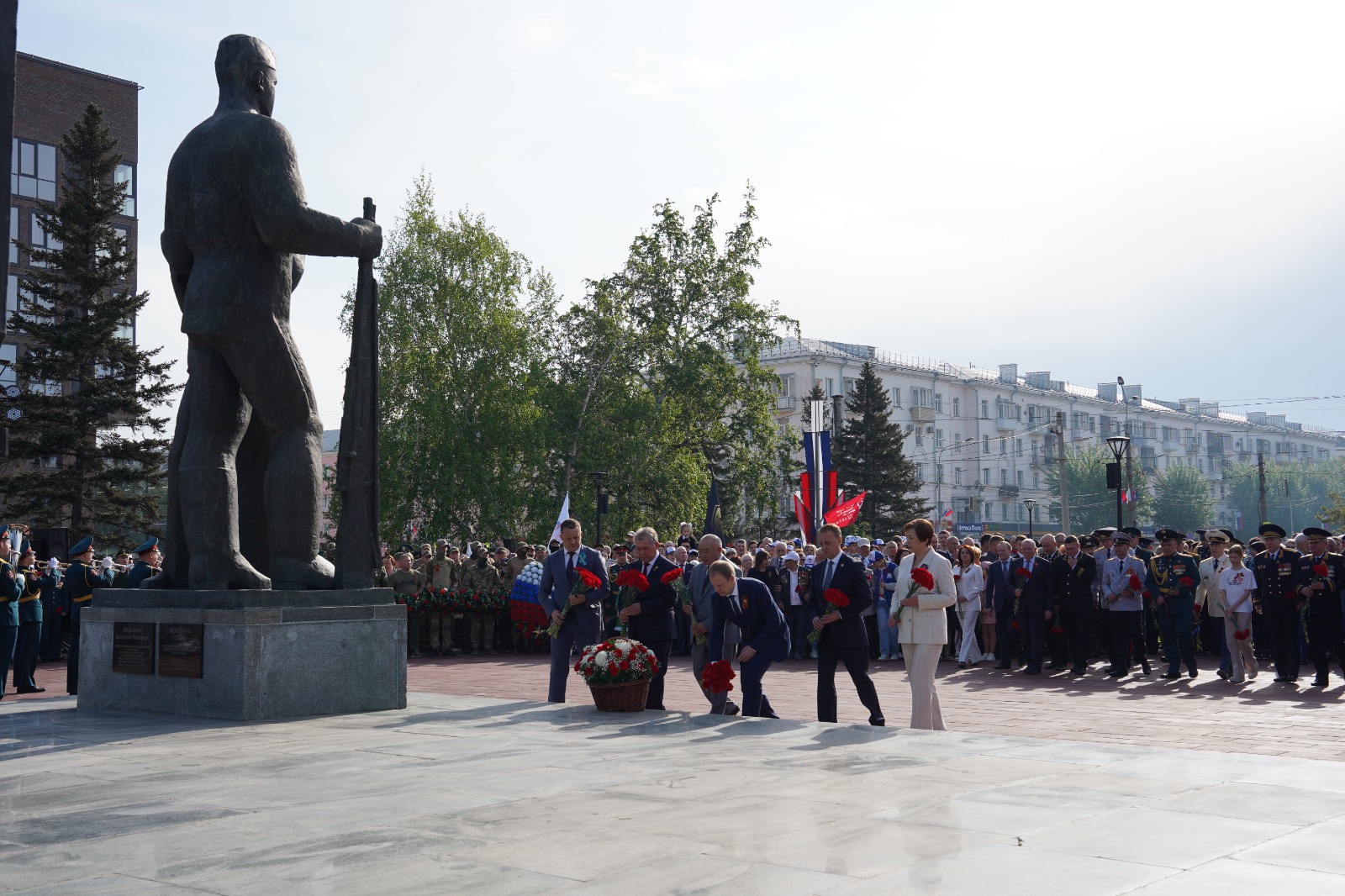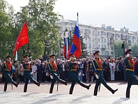 В честь героев почетный караул дал традиционный оружейный залп. После торжественной церемонии возложения цветов участники отправились на площадь Советов, где в 10.00 начнется торжественное прохождение войск гарнизона, а после на своем традиционном месте начнется движение «Бессмертного полка».
