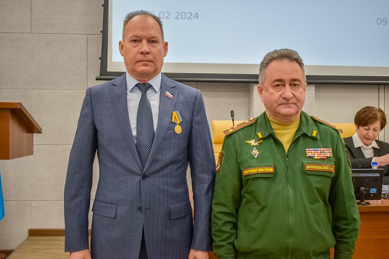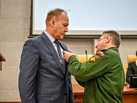 Перед началом заседания Думы военный комиссар Железнодорожного, Октябрьского и Центрального районов города Барнаула Александр Вопиловский вручил депутату Дмитрию Аганову медаль «За укрепление боевого содружества». Приказ о награждении подписал Министр обороны РФ, генерал армии Сергей Шойгу.
