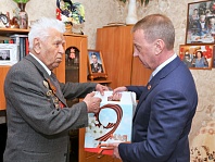 Вячеслав Франк от имени администрации города и жителей Барнаула поздравил Петра Яковлевича с наступающим Днем Победы, пожелал крепкого здоровья и долгих лет жизни: