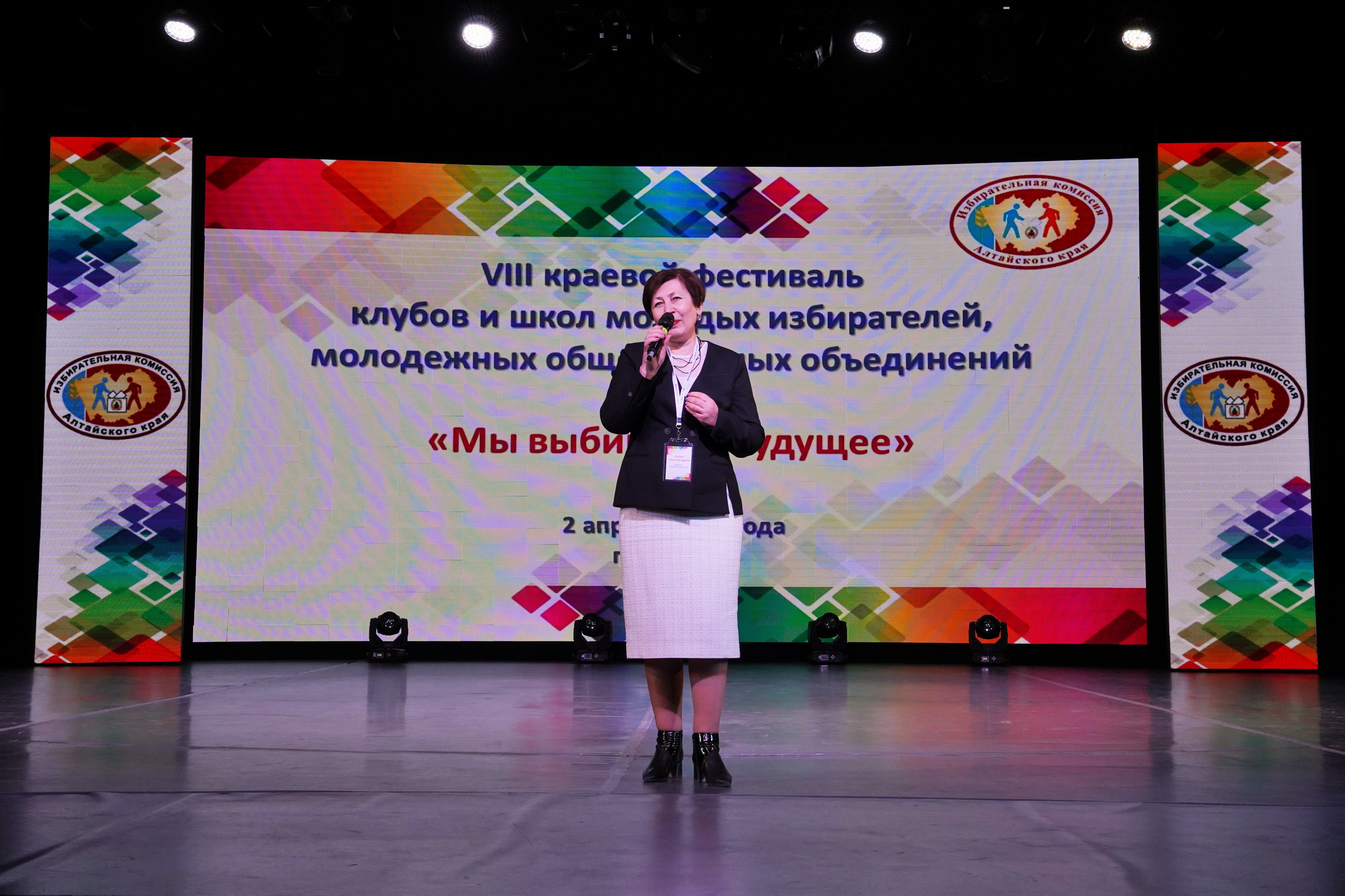 Обращаясь к участникам фестиваля со словами приветствия, председатель избирательной комиссии Алтайского края Ирина Акимова отметила, что фестиваль проходит в год 30-летия избирательной комиссии Алтайского края.